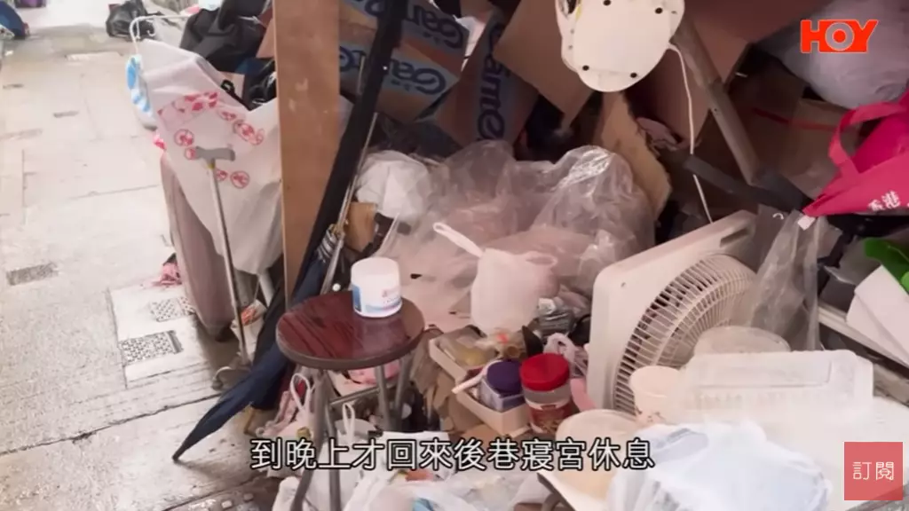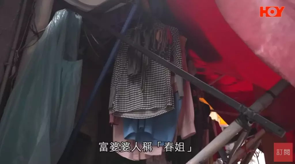 據《一線搜查》了解,這名富婆婆人稱「春姐」,街坊說她行動自如,喜好就是拾荒及露宿。後巷所見,富婆婆的家當相當齊全,衣物都有整理好掛起來,而且架設了一張床,床邊有藥物、食物,還有拐杖,甚至還掛了幾把風扇,接駁了電線到隔離大廈取電。