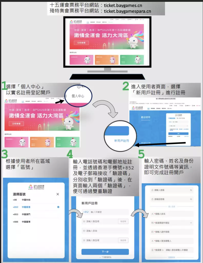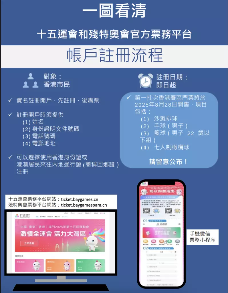 市民即日起可以香港身份證或港澳居民來往內地通行證,登入全運會和殘特奧會的官方票務網站,或在微信小程序實名註冊登記開戶。門票於本月28日開始,按賽程分階段、分批次發售,市民可以電子支付方式及相關賽區認可的有效入境身分證明文件,購買 3個賽區的門票。