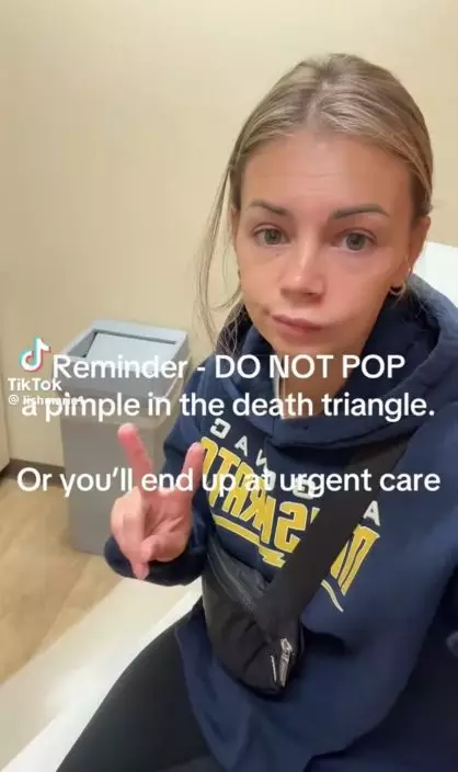 綜合外媒報導,美國一名婦人瑪莉(Lish Marie)近日於TikTok上分享自己因擠壓面部暗瘡被送院治療的慘痛經歷。她表示,當日發現鼻孔下方長有一顆囊腫型暗瘡,位置正好在皮膚科醫生宣稱的「死亡三角」(triangle of death)範圍內,她立即用手擠壓清除。