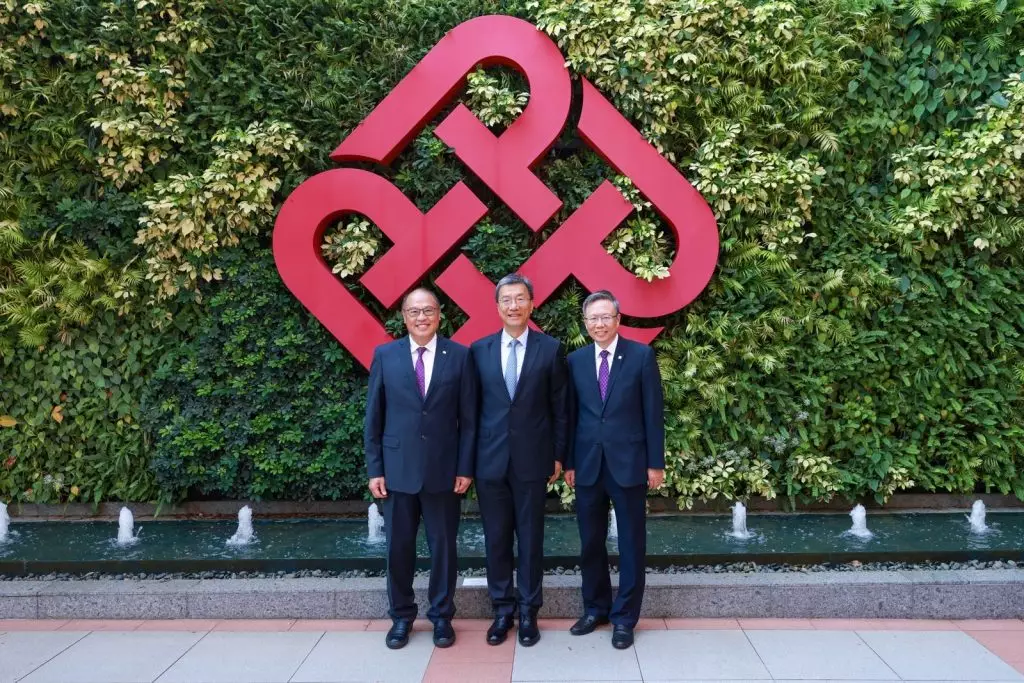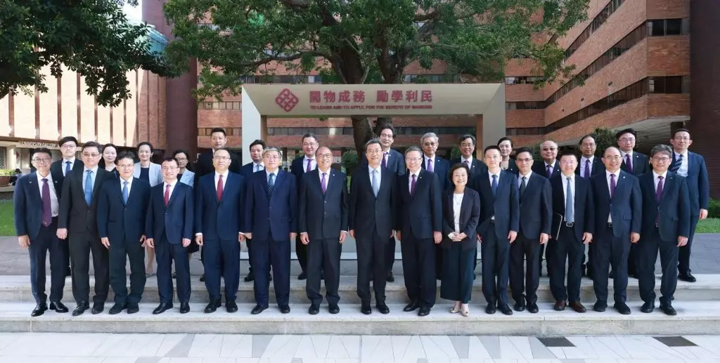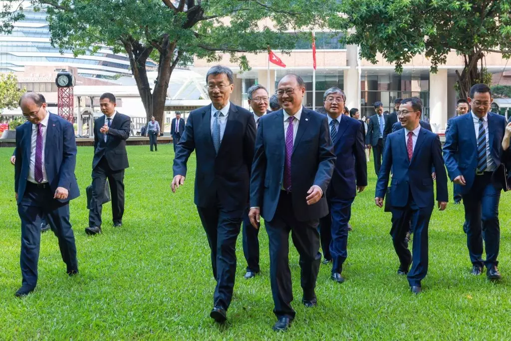 國家教育部部長懷進鵬(中)率團到訪理大,與理大校董會主席林大輝(左)及校長滕錦光(右)等理大領導層及代表會面交流。