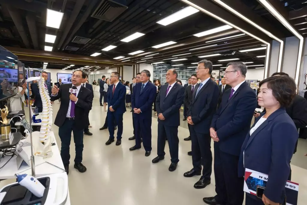 在理大校董會主席林大輝、校長滕錦光及一眾理大領導層陪同下,訪問團參觀了理大工業中心人工智能機器人實驗室,其間理大學者介紹和展示十個醫學、健康和人工智能相關領域的創新科研項目,充分展現理大在推動「醫工結合」及人工智能賦能醫學科研成果,如何引領新世代醫療發展。這些項目包括:協作生成式人工智能;可進行心血管疾病風險評估和常見眼疾篩查的人工智能眼底照相機;無輻射三維超聲脊柱側彎評估及無線掌上式超聲波脂肪肝和肝纖維化評估設備、人工智能賦能癌症精準診療的虛擬增強磁共振影像系統;支援中風患者遠端復康自動化管理功能的移動式外神經肌骨系統;可應用於醫學影像重建和分析的人工智能影像增強與復原技術;多肽新抗原疫苗技術平台─賦能精準癌症免疫治療;針對精神疾病客觀診斷、治療及病因解析的一體化人工智能、基因組學和生物醫學創新技術,以及人工智能驅動新結構抗生素候選藥物開發平台。
