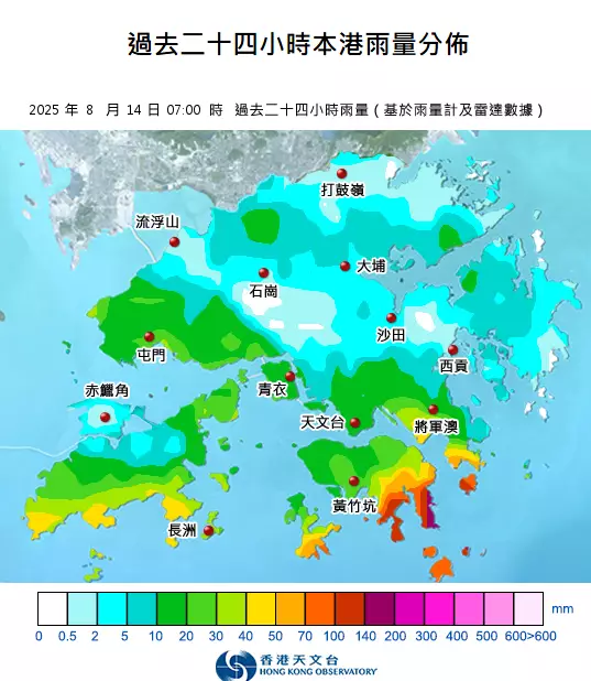 另外,天文台亦發出局部地區大雨提示,港島南區有大暴雨,每小時雨量預料或已超過100毫米,有可能出現嚴重水浸,市民請高度戒備,採取適當的預防措施,以減少大雨和水浸帶來的風險。