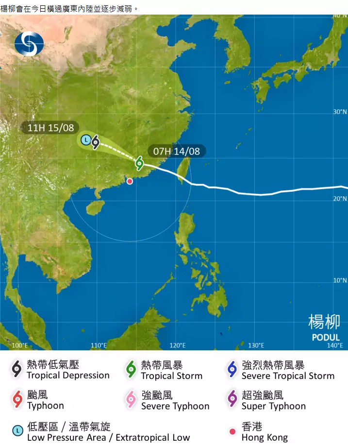 天文台早前說,楊柳已經在福建漳浦縣沿岸再次登陸,並減弱為強烈熱帶風暴,按照現時預測路徑,楊柳星期四會橫過廣東內陸及逐步減弱,但會較為靠近珠江口一帶,預料星期四本港會有狂風大驟雨及雷暴,初時部分地區雨勢較為頻密。