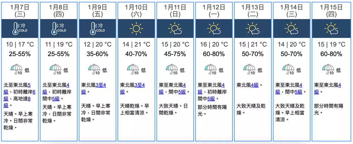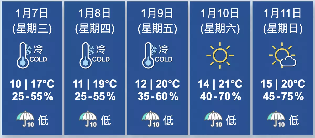 天文台預計未來一兩日早上持續寒冷,天晴及非常乾燥,週末期間氣溫稍為回升,但早上仍然清涼。