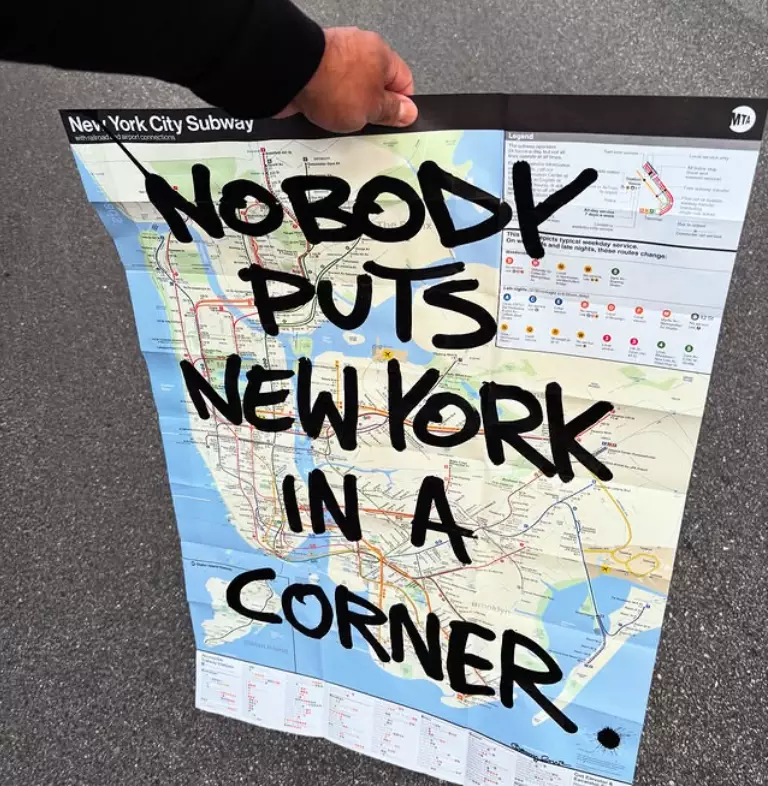 瑞典一名藝術家以紐約地鐵地圖為畫布創作暖心作品走紅,他在地鐵線路圖上繪製充滿城市情感的語句,如「紐約,我非常感謝你」,引發共鳴。