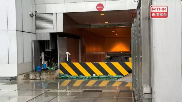 中聯辦外早上一度出現水浸,停車場有擋水板及堆放沙包。(盧紫菁攝)