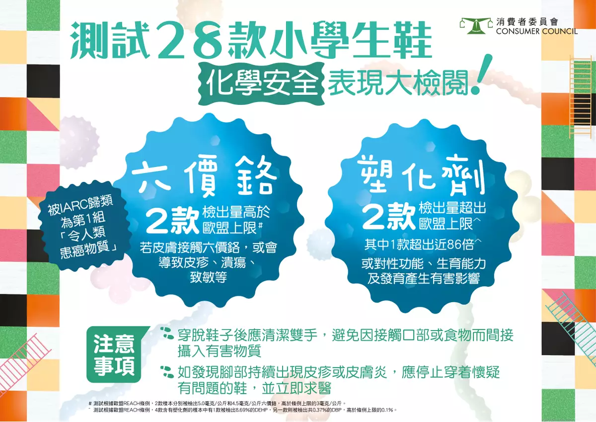 九月新學年就快開始,家長也忙着為子女準備開學用品,而一雙新鞋更是不可少。消費者委員會測試28 款小學生鞋樣本,其中 4 款樣本被檢出的六價鉻或塑化劑含量超出歐盟上限,當中 1 款塑化劑含量更超標近 86 倍,若兒童腳部有傷口或濕疹,會構成更高健康風險。