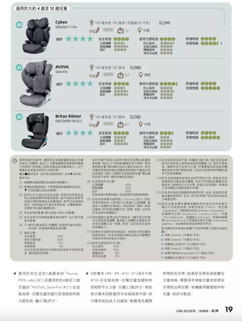 消委會發表國際消費者研究及試驗組織最新的測試結果,涵蓋22款在本港有售的兒童汽車安全座椅樣本。以5點評分為滿分,全部樣本在安全程度方面均至少獲3.5點評分,以適用於初生至大約1歲半嬰孩的組別為例,售價最低的2000多元樣本獲4.5分總評,最貴的7000多元樣本則獲3.5分總評,反映售價與表現未必成正比。