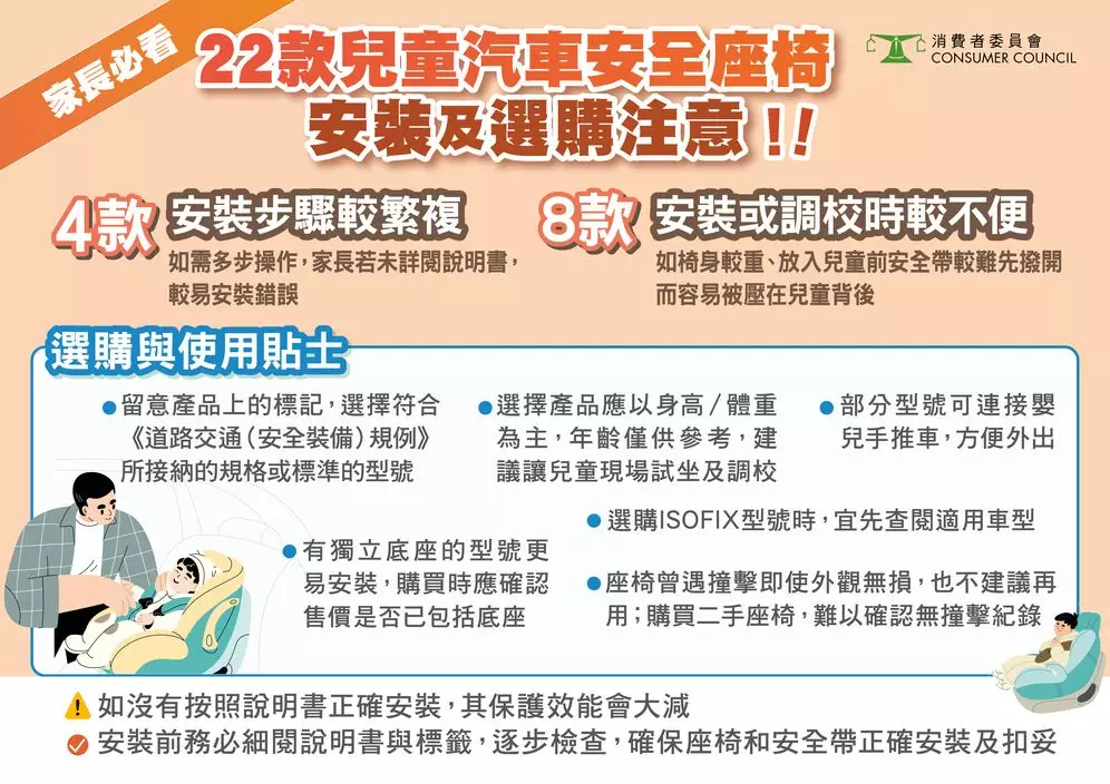 消委會呼籲,相關製造商改善兒童安全座椅的設計與使用說明,進一步提升撞擊防護能力,並確保產品使用指引內容清晰易明,讓家長容易理解和正確操作。