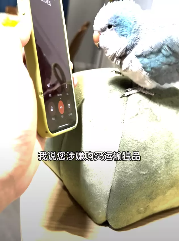 一隻鸚鵡代替飼主接聽詐騙電話,對方表示「因為你涉嫌購買運輸毒品,所以打這通電話來」。影片截圖
