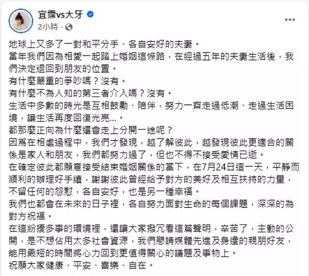 台灣女星大牙(周宜霈)今日(8月14日)突然透過社交平台及經紀公司發布聲明,宣布與結婚5年的羽毛球教練老公廖勛威(阿廖師)正式離婚,雙方已於7月24日完成手續。聲明中強調離婚並非因第三者介入或激烈爭吵,而是雙方在相處中發現「更適合做家人和朋友」,坦言「愛情已逝」,但仍感激彼此曾經的陪伴與支持。