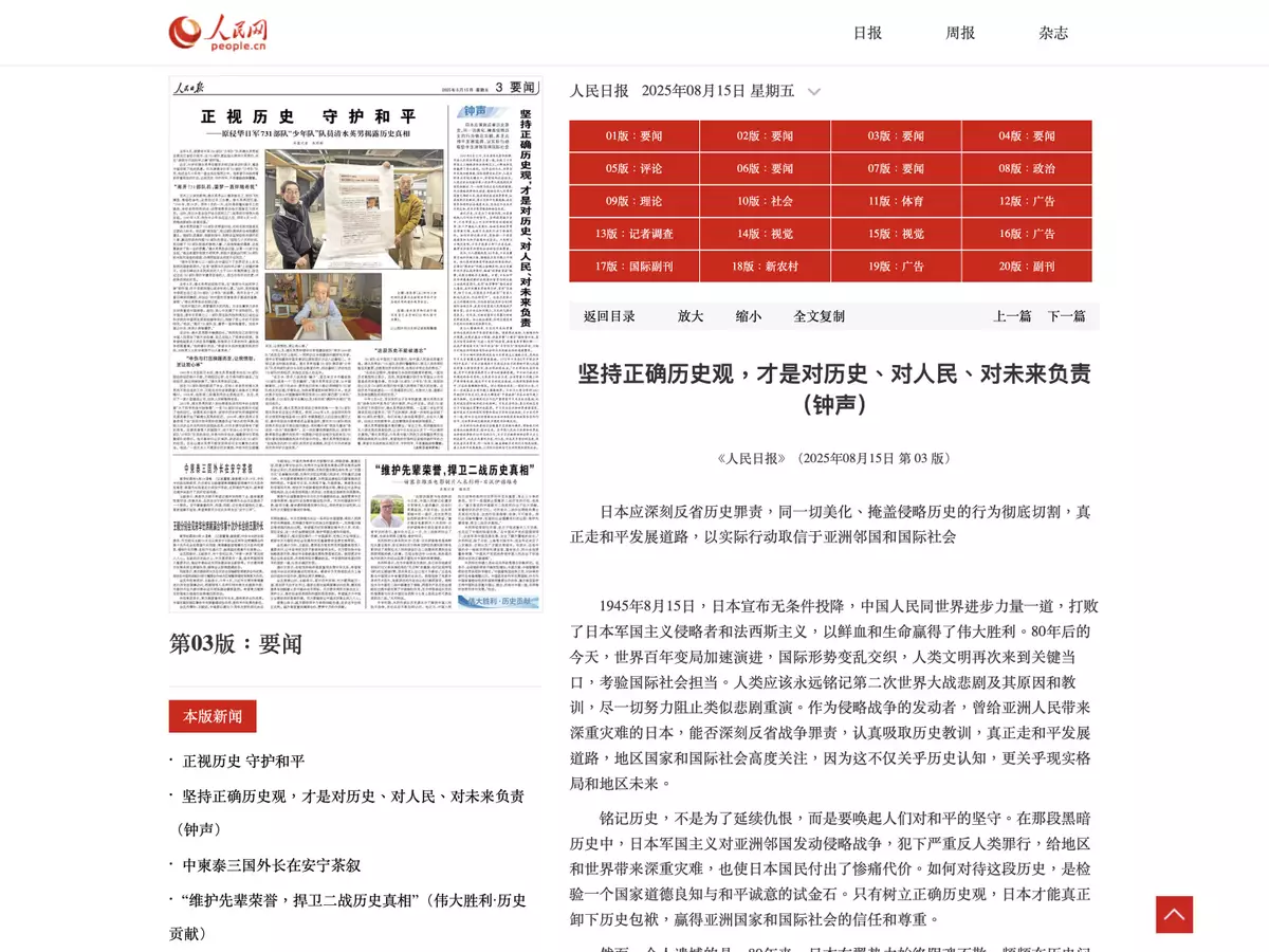 內地人民日報發表文章,指出日本在1945年8月15日宣布無條件投降,中國人民與世界進步力量,共同打敗了日本軍國主義侵略者及法西斯主義,以鮮血和生命贏得了偉大勝利。