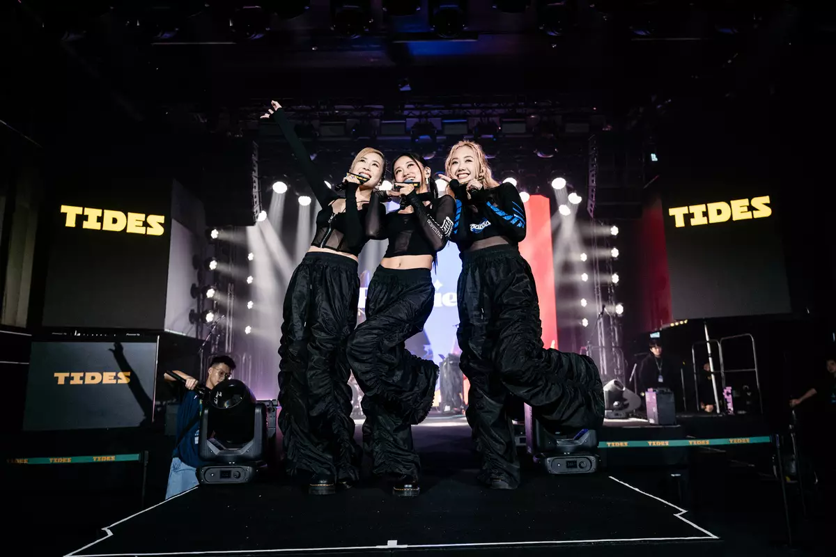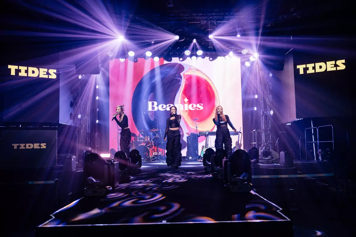 唱作女團Beanies則兵分三路巧妙地運用場地樓上閣樓出場,送上今年重點主打歌《失戀(及其他災難)》和輕快節奏作品《將快樂這刻蔓延(snap it)》,三位成員的甜美歌聲為現場注入青春能量,將快樂在此刻蔓延給全場觀眾。Beanies成員Jaime張天穎表示:「TIDES的舞台設計非常靈活,在構思演出項目和排位時可以加入更多創意元素。今次我們在上層登場再回到主舞台,與觀眾有近距離接觸,同時可以增加現場互動感。我們非常期待未來有機會在TIDES為粉絲帶來更多不同的演出!」另外成員阿左和Kay又讚謂:「我們很喜歡後台的休息空間配套新潮又完善,真係要俾Like!期待Beanies在TIDES開演唱會!」
