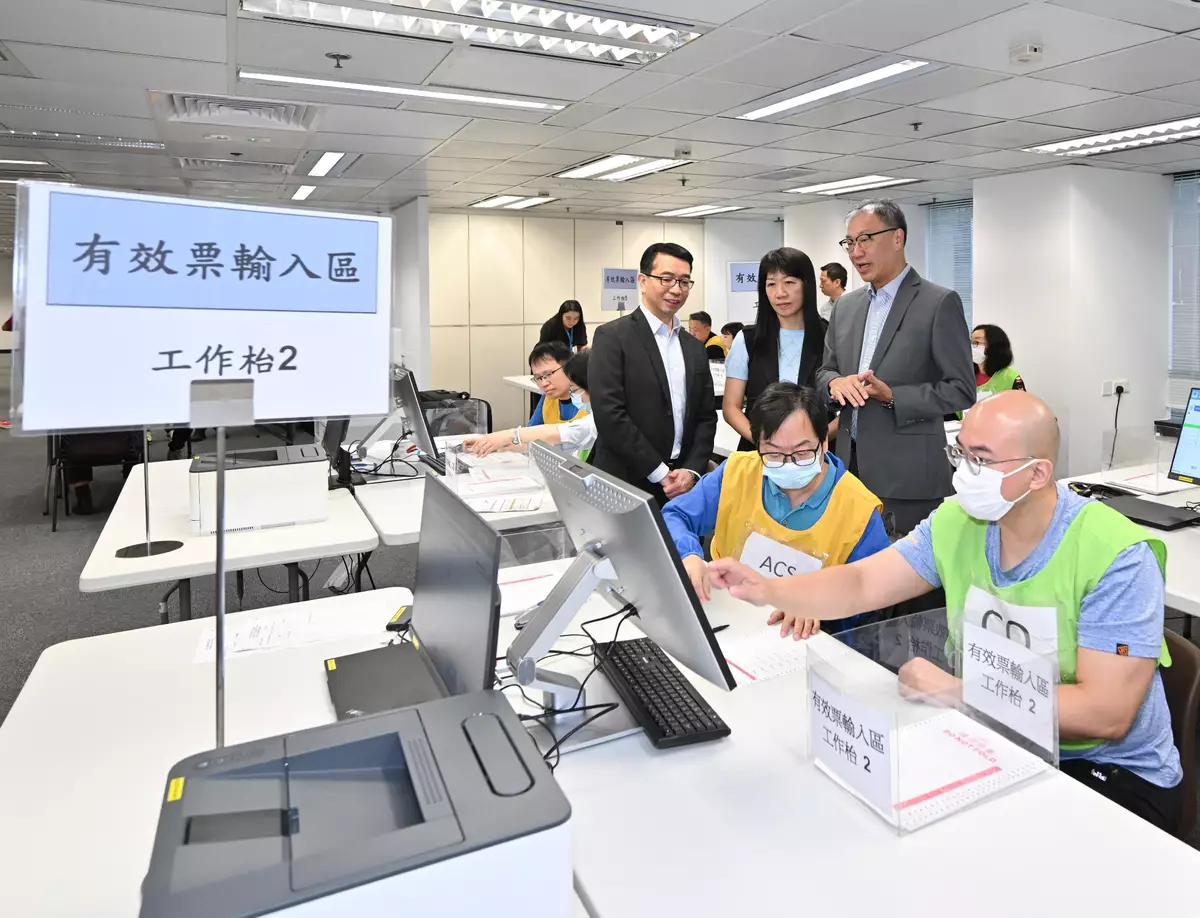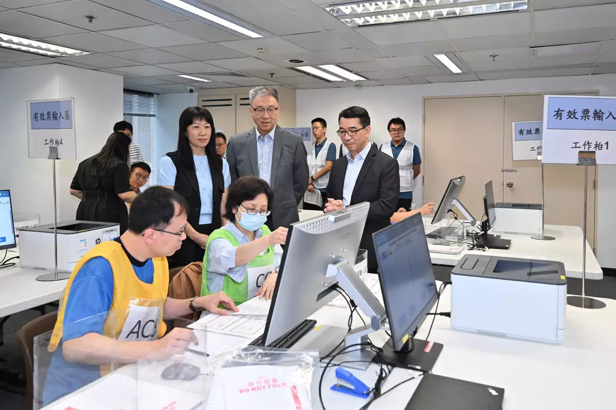 選委會界別分組補選9月7日舉行。選舉管理委員會主席陸啟康視察選舉事務處為中央點票站工作人員安排的實習訓練,了解訓練情況。