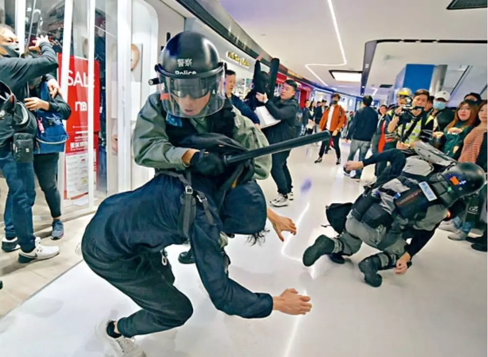 此時防暴警察進來追捕黑衣人,雙方在商場混戰,內地和香港顧客則夾雜其中,成為當年聖誕的「獨特奇景」。與此同時,一批黃店則在其他區搞「黄色耶誕」,出售支援手足的「抗爭聖誕咭」,一片末世境象。