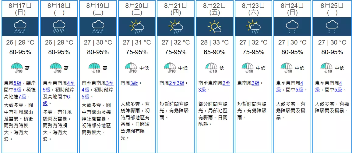 至於星期六的天氣,下午部分時間有陽光及炎熱。局部地區有驟雨。晚上大致多雲。吹和緩至清勁偏東風,離岸及高地間中吹強風。