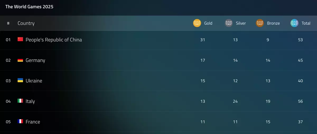 世運會奬牌榜。官網圖片