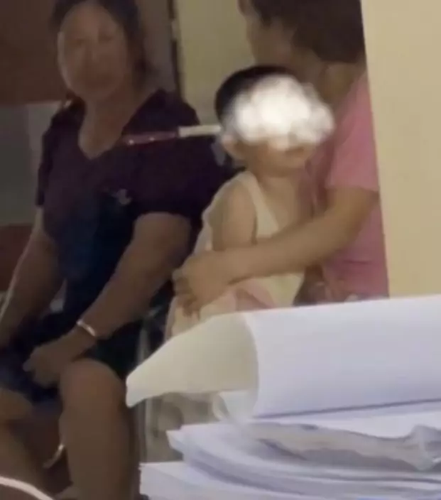 3歲女童頭插水果刀淡定步入醫院手術室。影片截圖