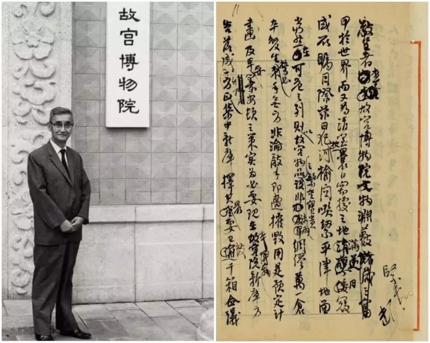 1932年,時任故宮博物院院長易培基(左圖)向當時的「行政院」呈送文物南遷方案,右圖為公文底稿。圖片來源:故宮博物院