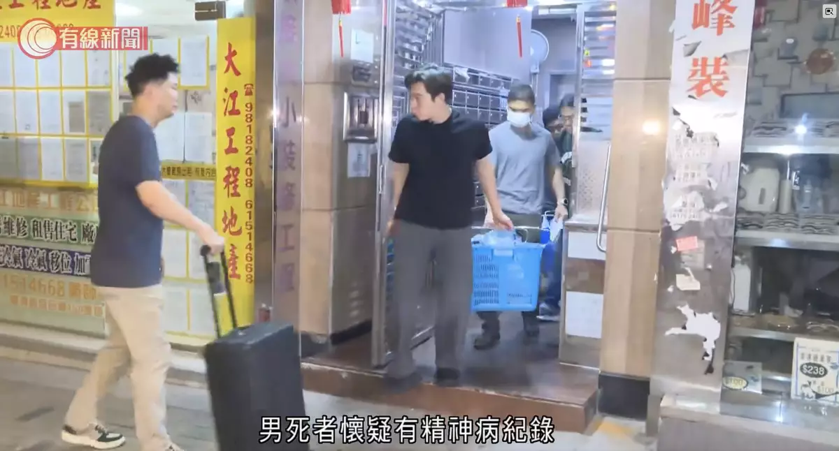 葵涌和宜合道瑞景大廈一個劏房揭發雙屍命案,警方帶走證物。有線新聞截圖