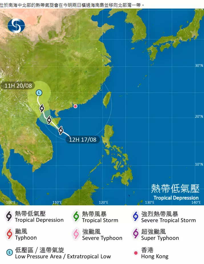 天文台表示,在正午12時,位於南海中北部的熱帶低氣壓集結在香港西南偏南約640公里,預料向西北移動,時速約15公里,大致移向海南島一帶。