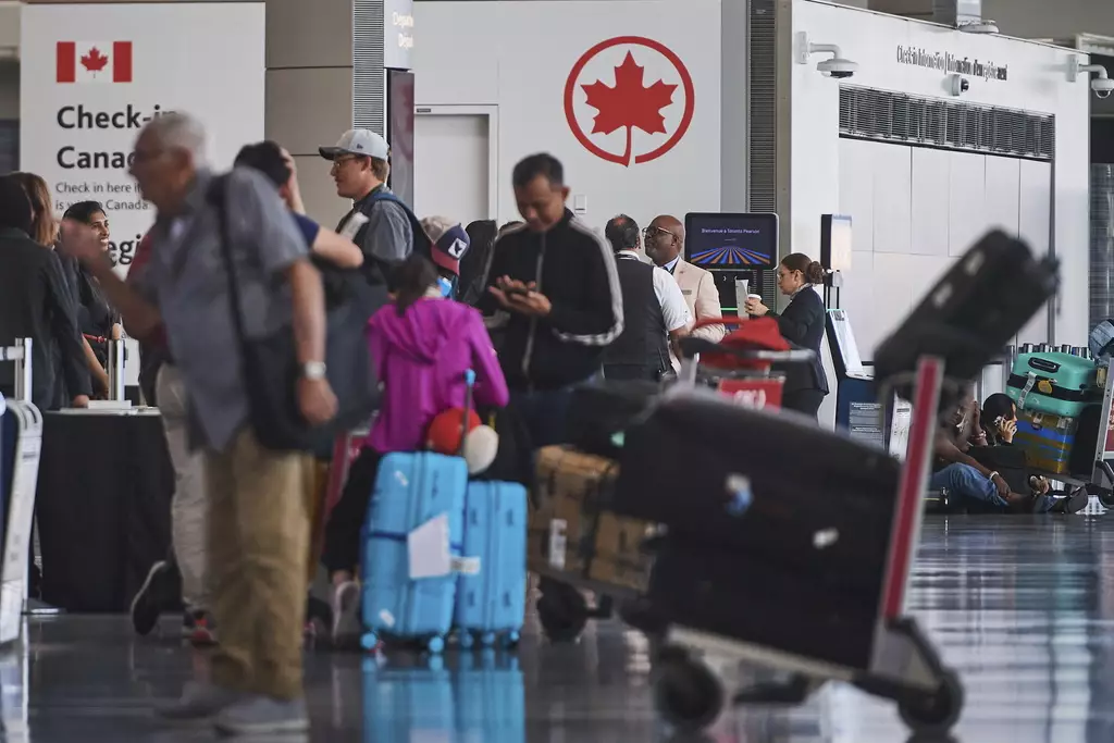 旅客在多倫多皮爾遜國際機場加航櫃位外等候。CP/AP圖片