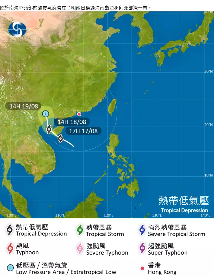 天文台表示,在下午5時,位於南海中北部的熱帶低氣壓集結在香港西南約660公里,預料向西北偏西移動,時速約15公里,大致移向海南島西南沿岸一帶。