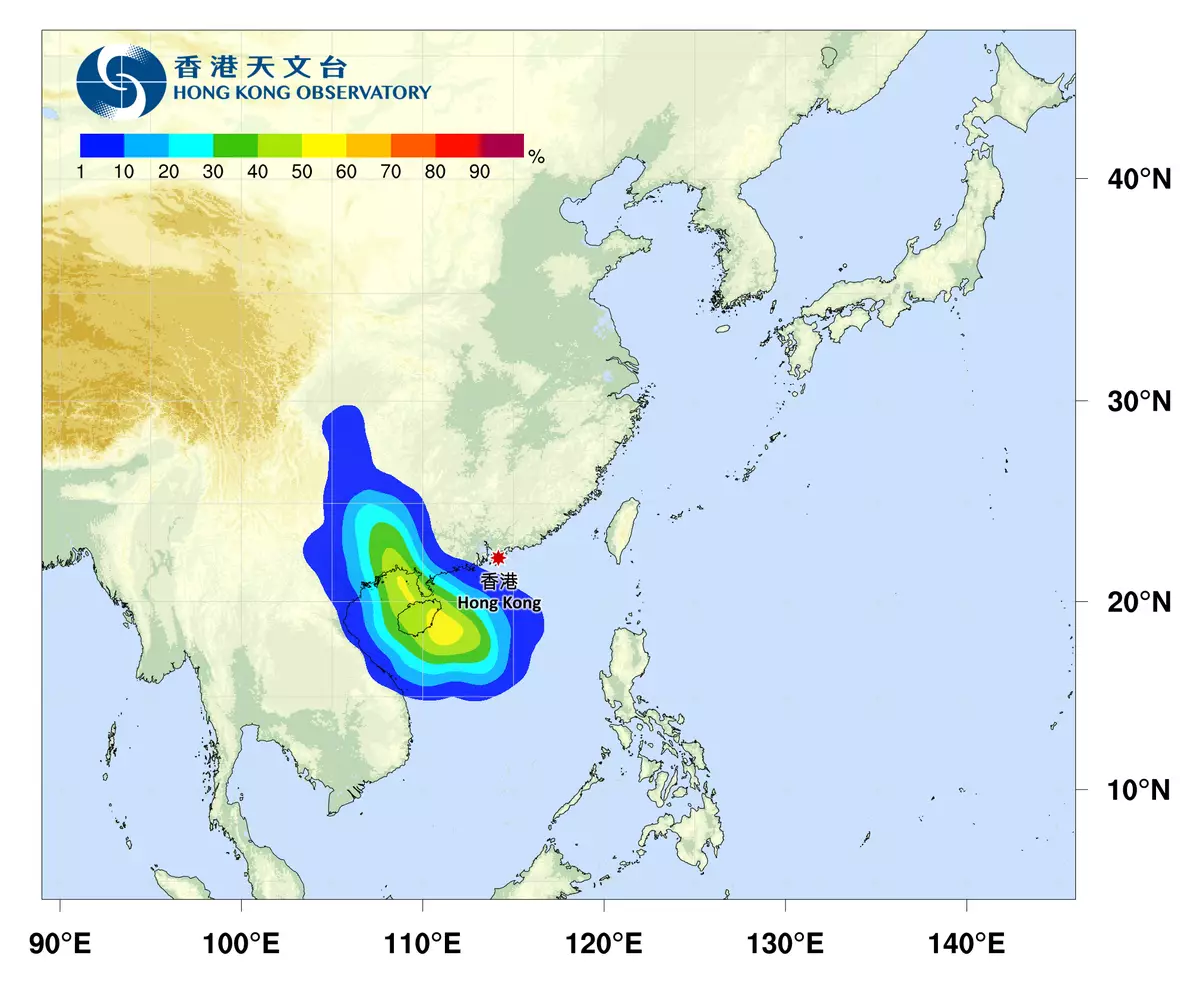 天文又稱在下午8時,位於南海中北部的熱帶低氣壓集結在香港之西南約680公里,即在北緯17.8度,東經109.7度附近,預料向西北偏西移動,時速約15公里,大致移向海南島西南沿岸一帶。