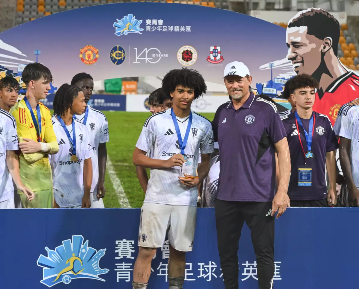曼聯名宿舒米高賽後將「最佳球員獎」頒發予大演帽子戲法的曼聯U16 九號球員甘倫。
