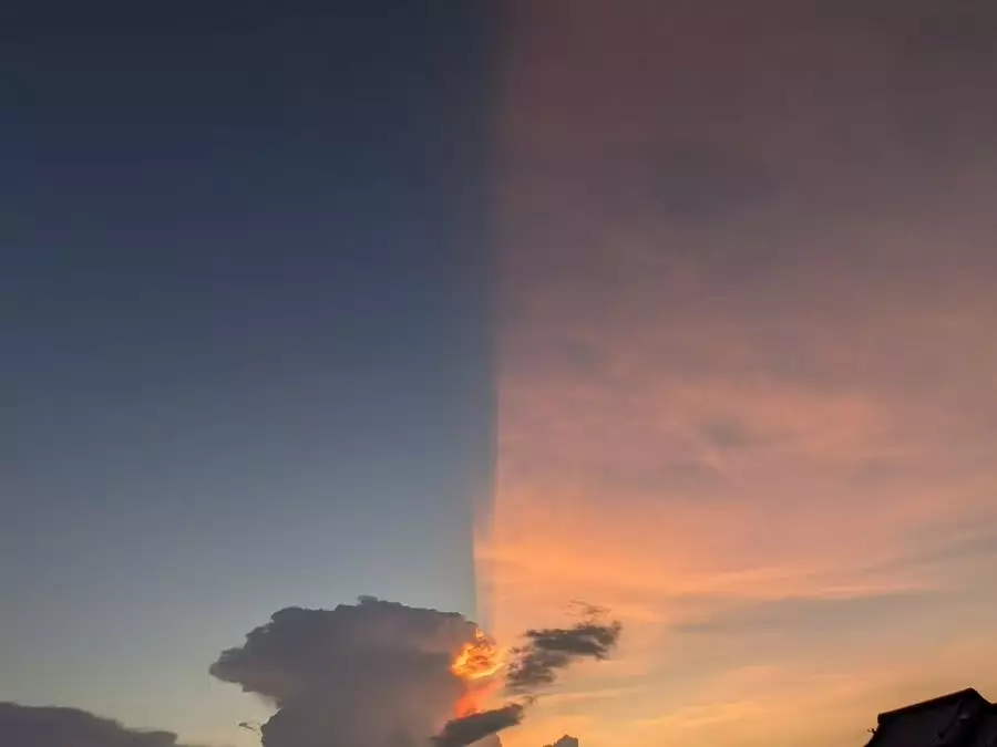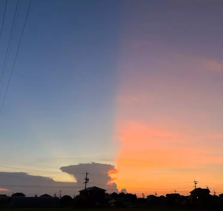 照片可見,天空彷彿被無形界線「一分為二」,右側瀰漫著橙紅色晚霞,左側則籠罩在夜幕藍色之中,形成「晝夜共存」的震撼畫面,令不少人驚歎不已。不過,這幕奇觀僅維持數分鐘,隨後猶如融化般逐漸消散。