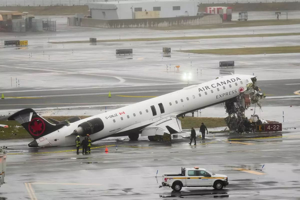 消防員及調查人員於2026年3月23日周一檢查現場,一架加拿大航空客機在周日晚於紐約拉瓜迪亞機場降落後,與一輛港務局消防車相撞,停留在該處。(美聯社圖片/塞思韋尼格) AP圖片