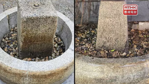 現時在中英街的三號(左)與四號界石 (中)日佔時曾被拔掉,戰後重新豎立。(黃佩珊攝)