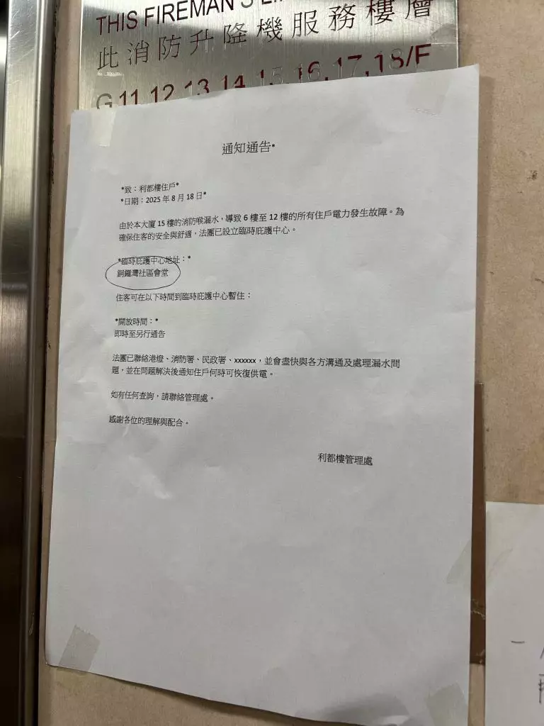 北角英皇道利都樓星期一(18日)因滲水致電力裝置故障,6至12樓共7層單位停電,約100戶住客受影響。