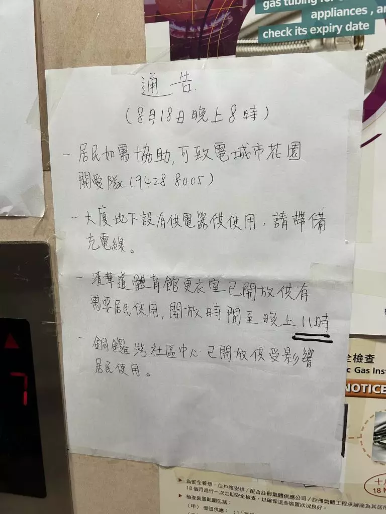 據住戶表示,當天中午1時已開始出現停電,至今已經超過10小時。當晚接近放工時分,受影響住客陸續得知消息,現場有不少住客聚集在地下等待最新通知。城市花園關愛隊到場派發飲用水和簡易照明裝置,並引導有需要的住戶前往銅鑼灣社區會堂作臨時休整。不過仍有不少住戶選擇自行到附近的酒店暫住,形容「全屋停電黑晒,冇得煮飯、沖涼、叉電,好唔方便,只能到外面住住先。」