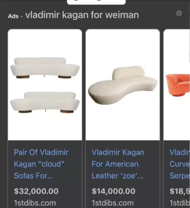 原來,這張梳化是美國傢俱大師弗拉基米爾·卡根(Vladimir Kagan)的作品。後來,她因好奇上網查詢價格發現,雖然未找到完全相同款式,但見到多張相近設計的梳化價格均高達約2萬美元(約16萬港元),令她大感錯愕,「我還以為是我佔了別人便宜,果然世界上沒有這麼好的事」。