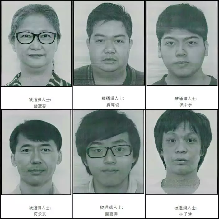 「香港議會」16人列潛逃者,包括錢寶芬(左上一)、夏海俊、侯中宇等,早前被警方國安處以「顛覆國家政權罪」懸紅通緝。警務處國家安全案件通緝人士及懸紅公告