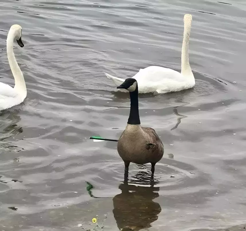 據外媒報道,在法國厄爾-盧瓦省 Mézières-Écluzelles的湖面上,一只加拿大雁被箭射穿了身體,卻頑強地活了下來。目擊者 Séverine 第一次看到牠時,差點把手機掉水裡,「我走到湖邊,突然看到牠側身插著一根箭,還在撲騰!太震驚了,我趕緊拍了照。」