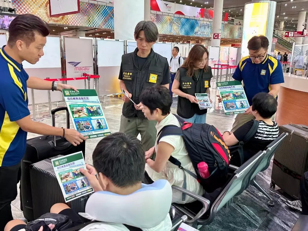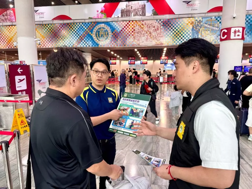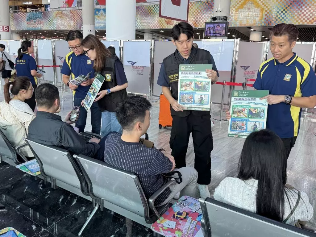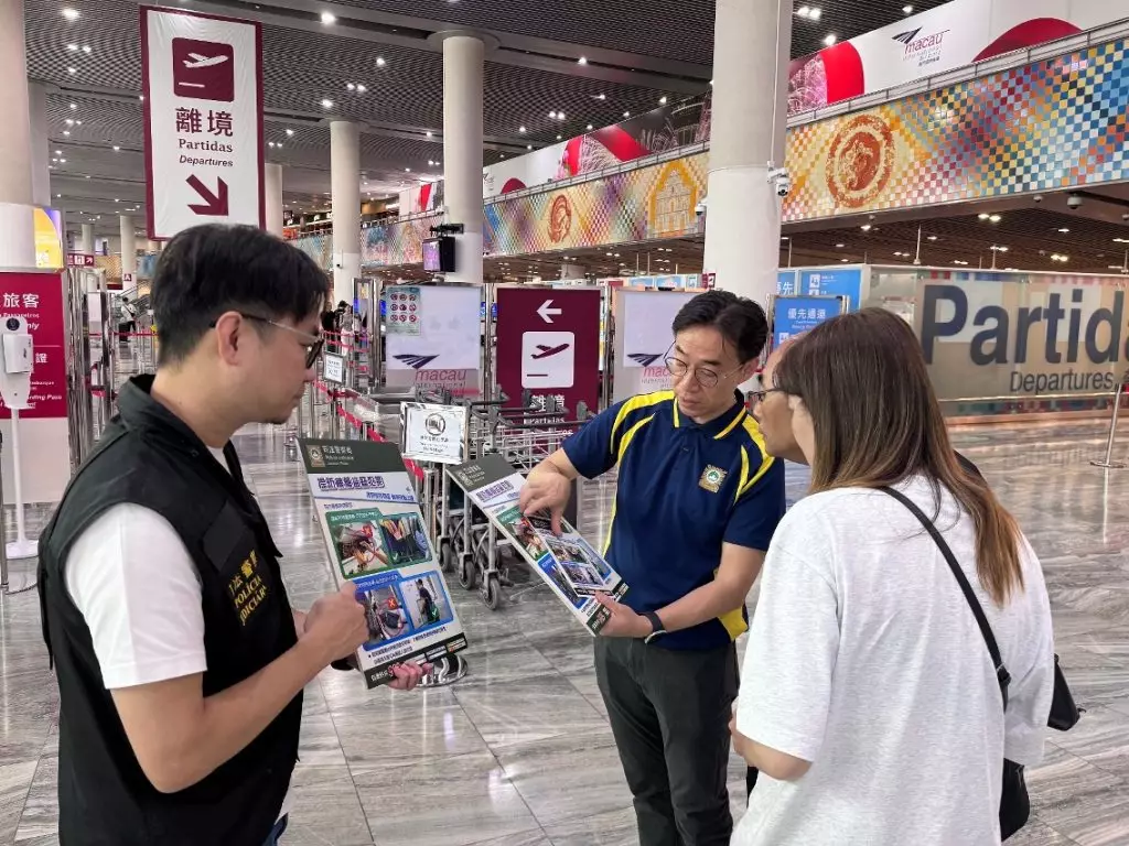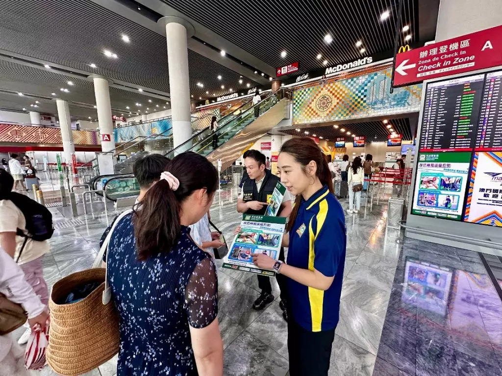 司警局到機場宣傳防罪資訊,提醒公眾注意出行安全。澳門政府新聞局圖片