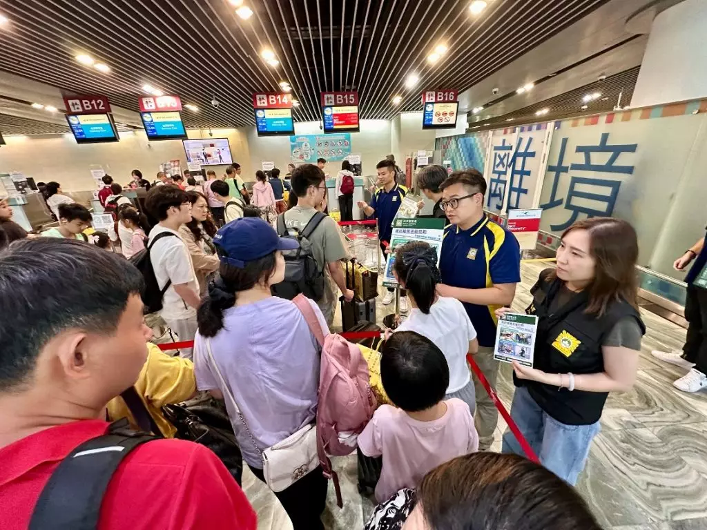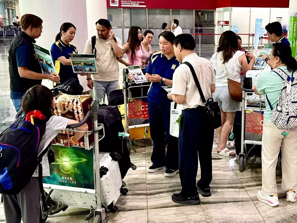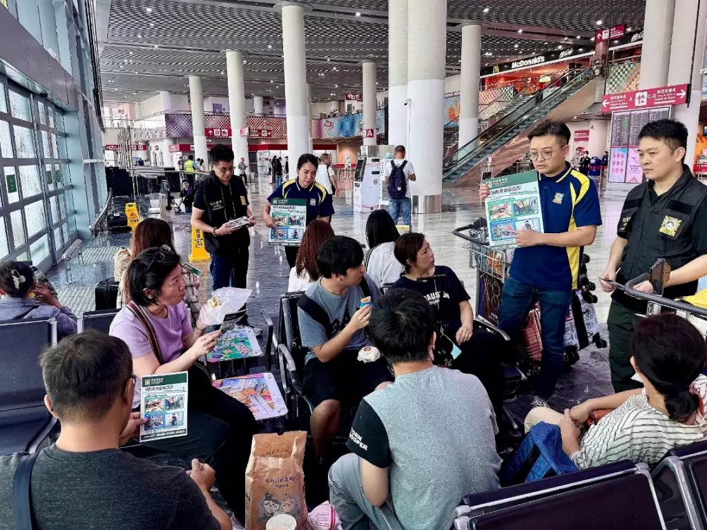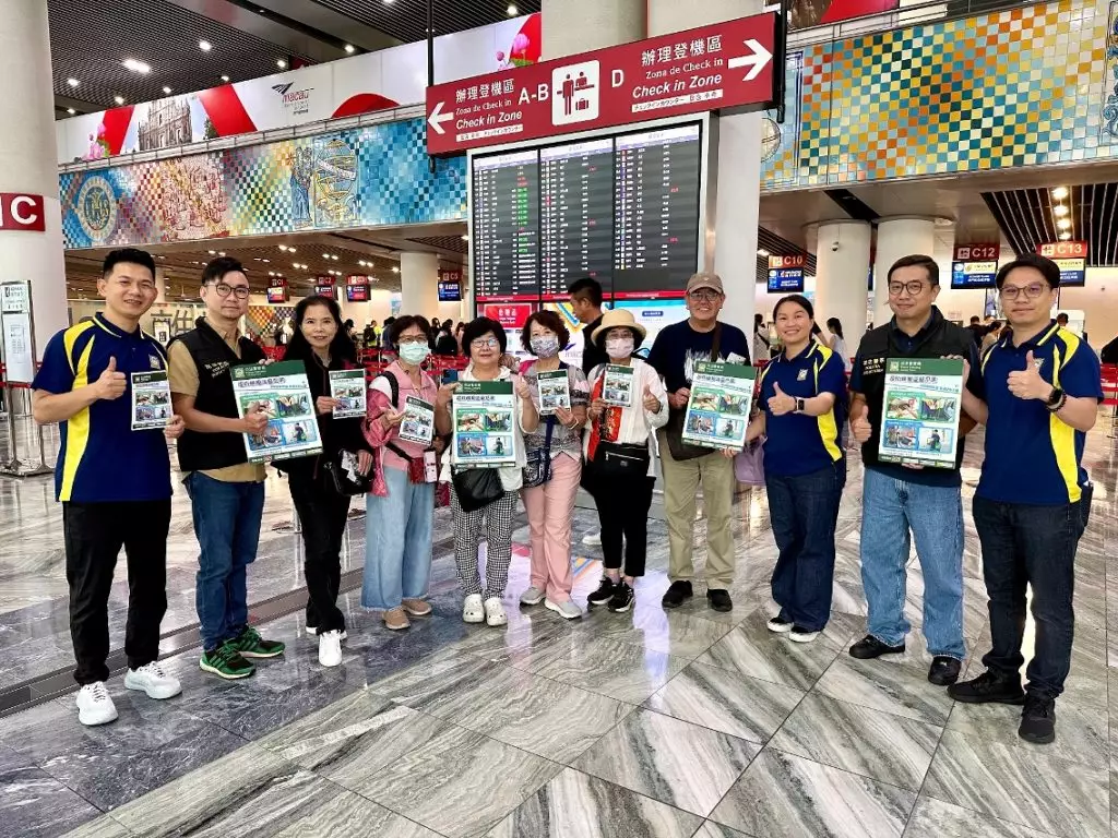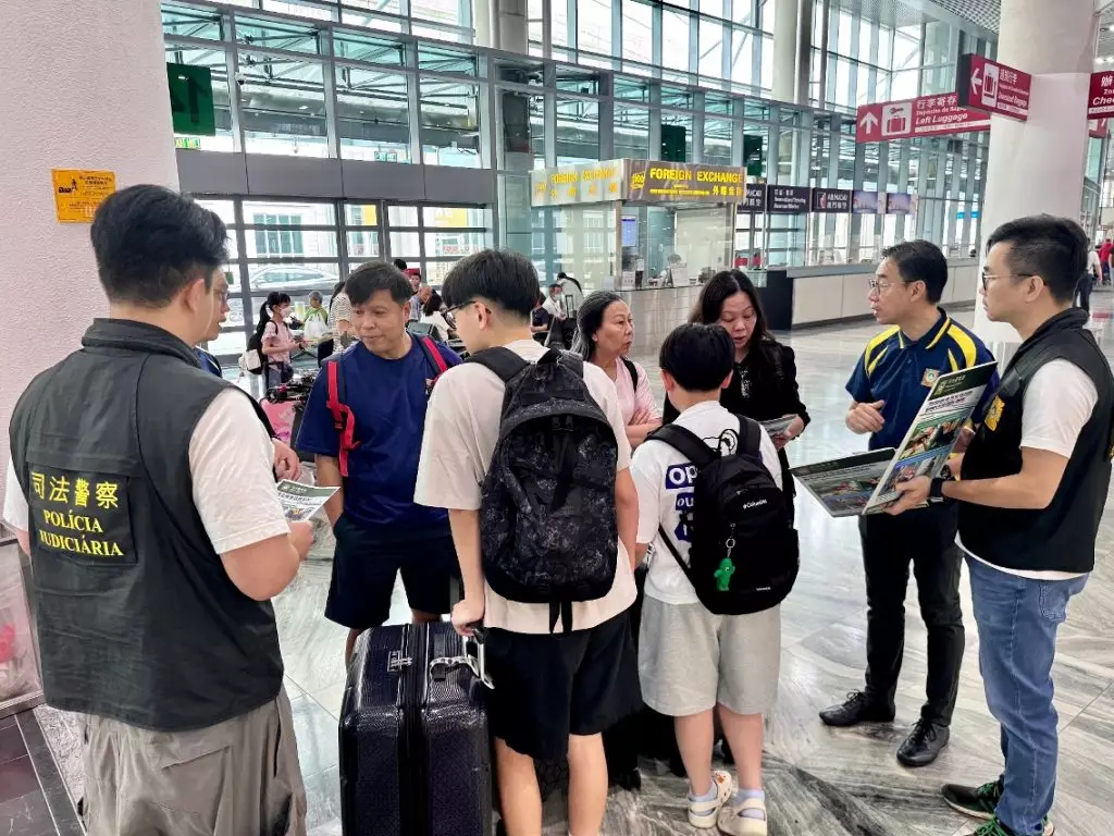 司警局到機場宣傳防罪資訊,提醒公眾注意出行安全。澳門政府新聞局圖片