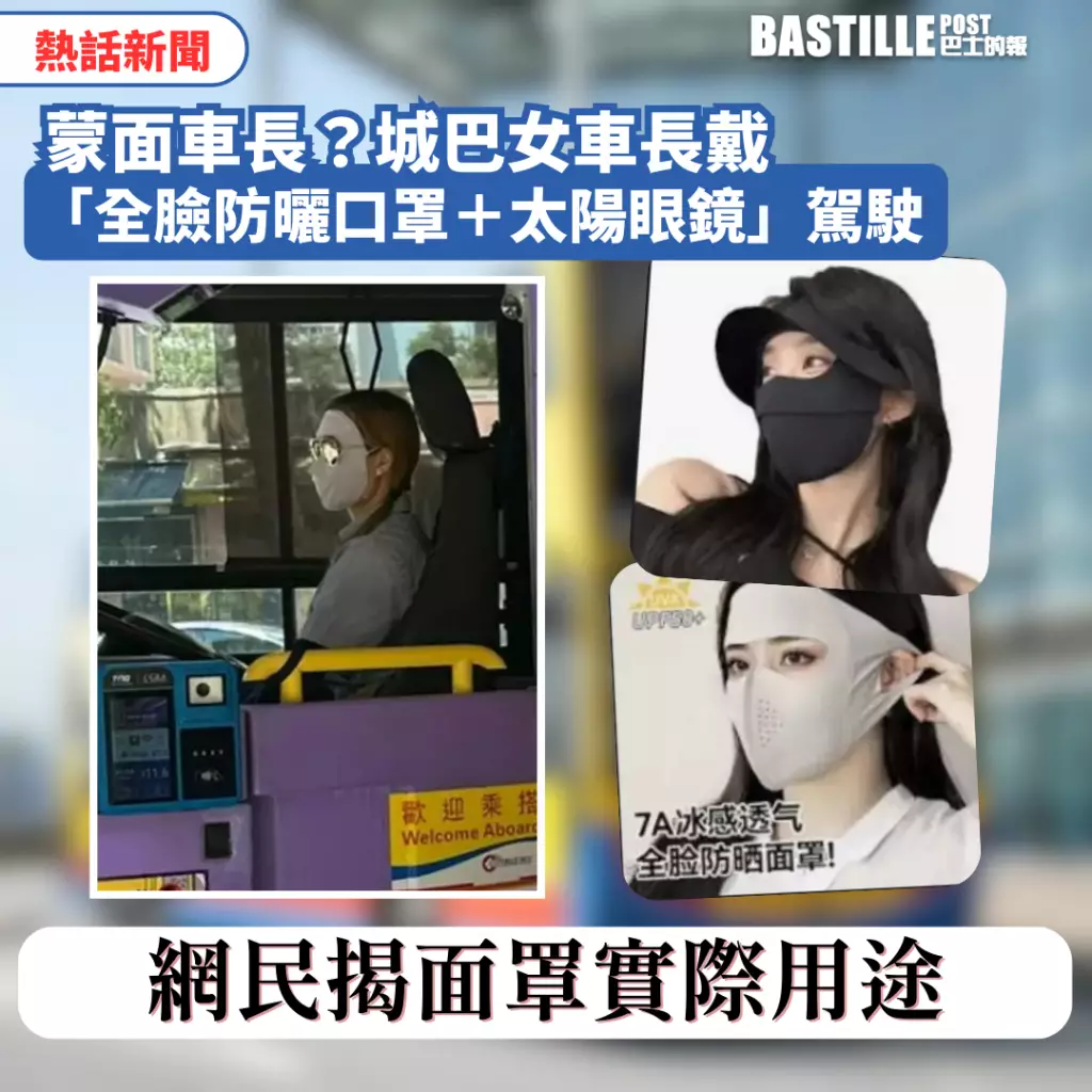 香港網絡近日流傳一張引發熱議的照片,一名城巴女車長在駕駛時佩戴「全臉防曬口罩」及太陽眼鏡,將面部完全遮蓋,被網民戲稱為「蒙面車長」!