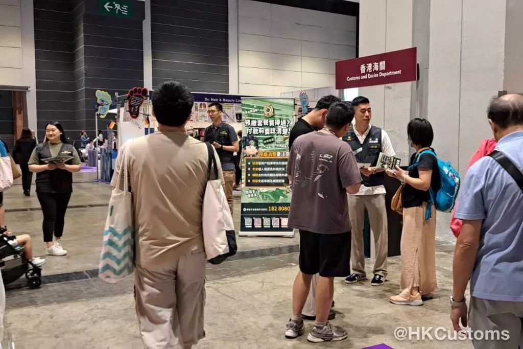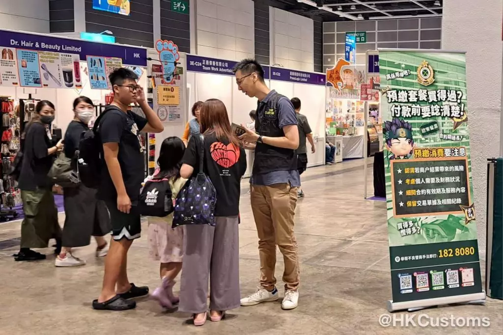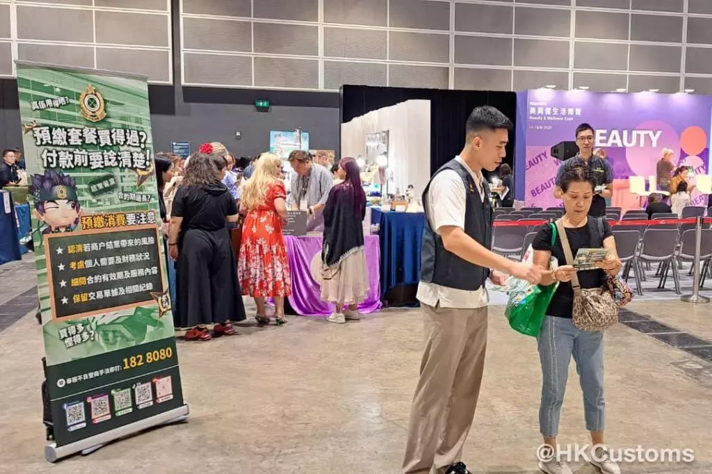 海關宣傳隊一連五日(8月14日至18日)現身會展中心,向參與「美與健生活博覽」市民派發宣傳單張,提醒消費者購買預繳套餐需注意事項及風險。