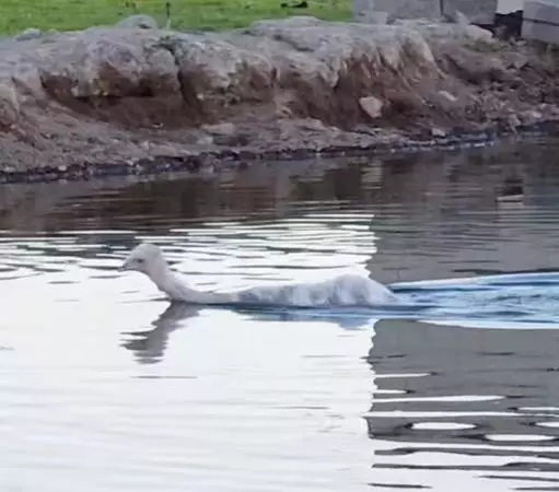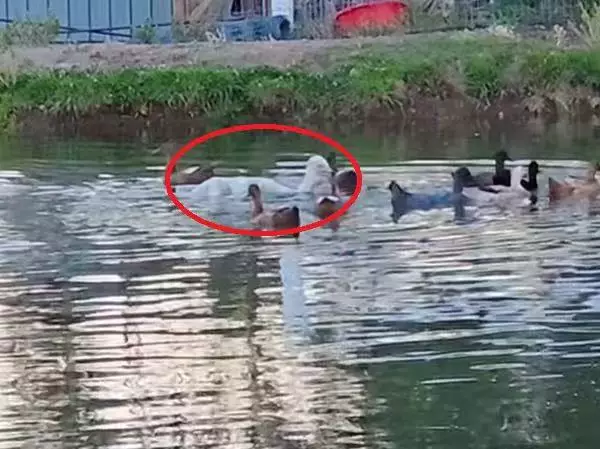 長頸鴯鶓混入鴨群一起游泳,古怪泳姿惹關注。影片截圖
