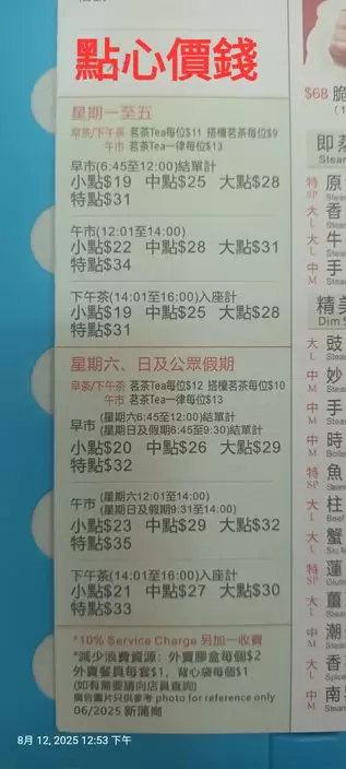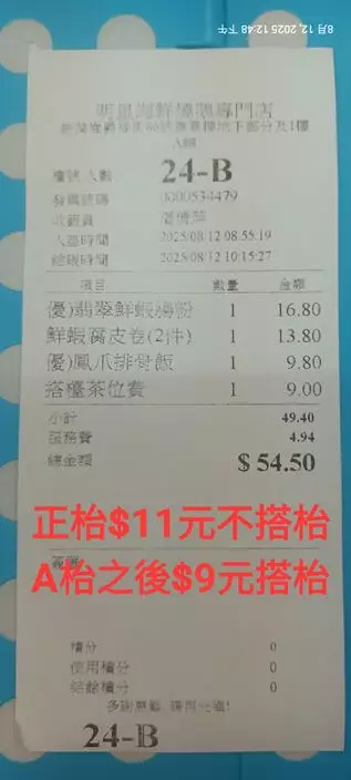樓主表示,酒樓將座位分為「正枱」和「ABCD枱」,分別代表兩種類型「搭枱」與「不搭枱」。如選擇「搭枱」,在茶錢上會有所分別。由她上傳的點心紙所見,星期一至五,早市及下午茶每位的茶錢為11元,如果搭枱則可減少2元,只需9元。而在星期六日及公眾假期,早茶及下午茶的茶錢也同樣分為搭枱和不搭枱,每位茶錢為12元,如果搭枱則可減少2元,只需10元。而午市則統一收費13元。總之食客不想搭枱的話,每位茶錢就要加多2元。