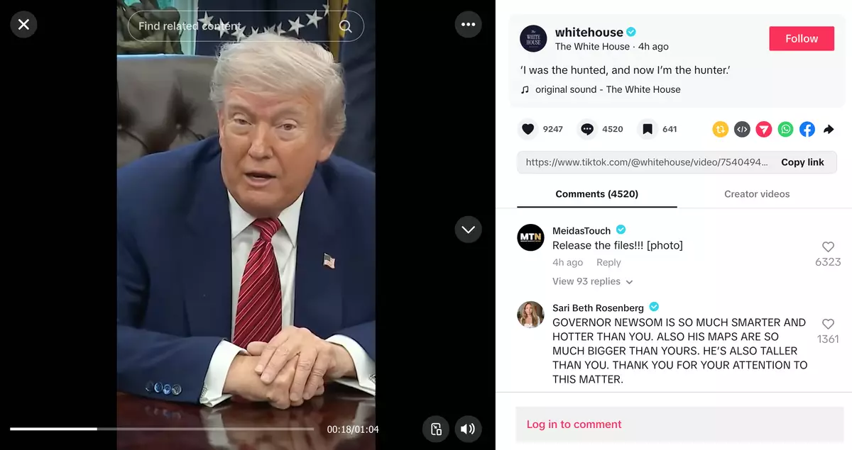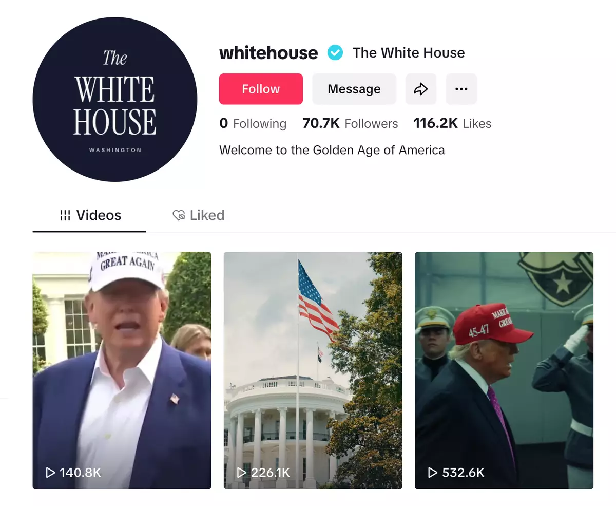 美國白宮在TikTok開設官方帳號,利用這個影片分享程式在美國擁有超過1億5千萬用戶的優勢,傳播總統特朗普的信息。