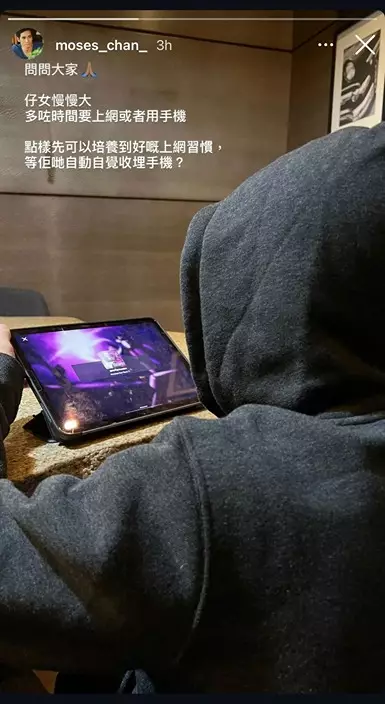 不過,「三年抱三」的「娛圈多仔公」背後也有說不完的育兒煩惱!隨着子女陸續返校,阿Mo 近日罕有在限時動態上載大兒子用平板打機的背影,並留言:「問問大家,仔女慢慢大,多咗時間要上網或者用手機,點樣先可以培養到好嘅上網習慣,等佢哋自動自覺收埋手機?」短短一句即引起大批家長網友共鳴,笑言視帝原來同樣有「開學恐慌症候群」,育兒煩惱同樣不少。