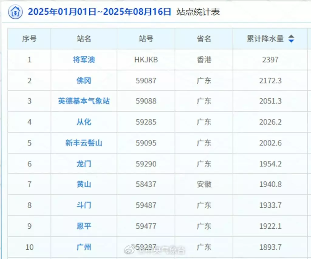 從中央氣象台發布的「全國降水量實況圖」可見,本港將軍澳氣象站期內錄得累計降雨量達2397毫米,位列全國第一;而降雨主要集中在廣東至杭州等沿海地區,其中廣東省更包辦排行榜9個席位,大灣區城市佔6席。前10名中唯一非廣東的氣象站,為位列第7位的安徽黃山氣象站,累計降雨量達1940.8毫米。