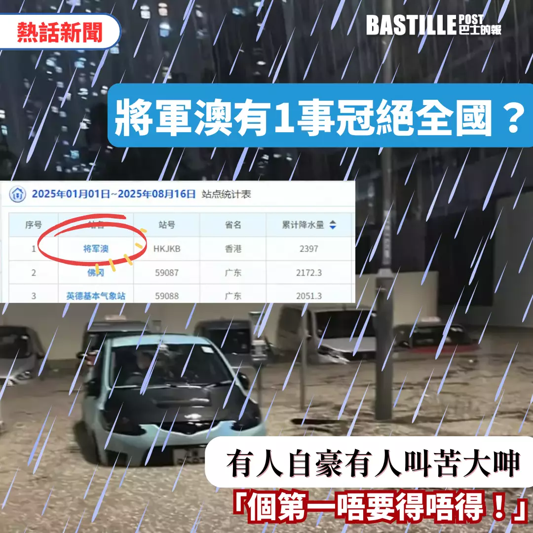 中央氣象台19日公布2025年全國雨量排行榜,統計數據顯示香港將軍澳區以2397毫米降雨量高居榜首,較第二名廣東清遠市佛岡縣多出225毫米,成為今年國內最潮濕地區!