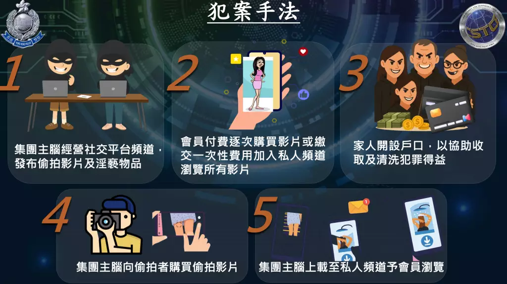 警方指出,此次犯罪集團在社交平台經營免費公開頻道,張貼色情主題預覽影片及相片,包括學生裙底偷拍內容,吸引用戶繳交一次性會員費成為VIP會員,或按次購買特定內容。 頻道已營運三年,截至現時為止,會員人 數接近9000人。兩名報稱無 業的夫妻 主腦負責管理頻道,部份骨幹成員則提供色情及偷拍影像,目標多為女性,拍攝地點集中在本地公共交通工具或車站、商場等高人流場所。集團利用家人及成員戶口收取並清洗犯罪得益,總值大概港幣400萬元。