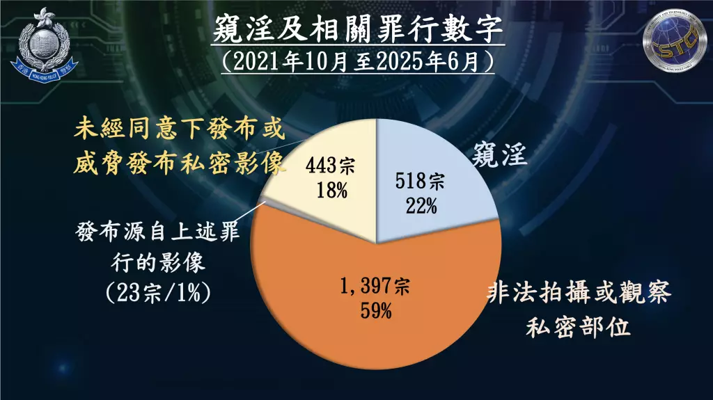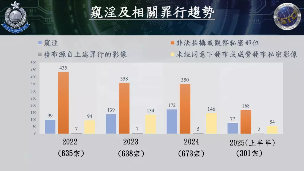 警方表示,自《刑事罪行條例》(第20章)有關窺淫罪行於2021年10月生效以來,過去3年,警方每年接獲案件大概 650宗,當中超過一半涉及「非法拍攝或觀察私密部位」罪行,另外22%與「窺淫」罪有關,18%則與「未經同意下發布或威脅發布私密影像」罪行有關。2025年上半年警方接獲案件宗數為301宗,對比上年同期343宗,輕微下跌12%。