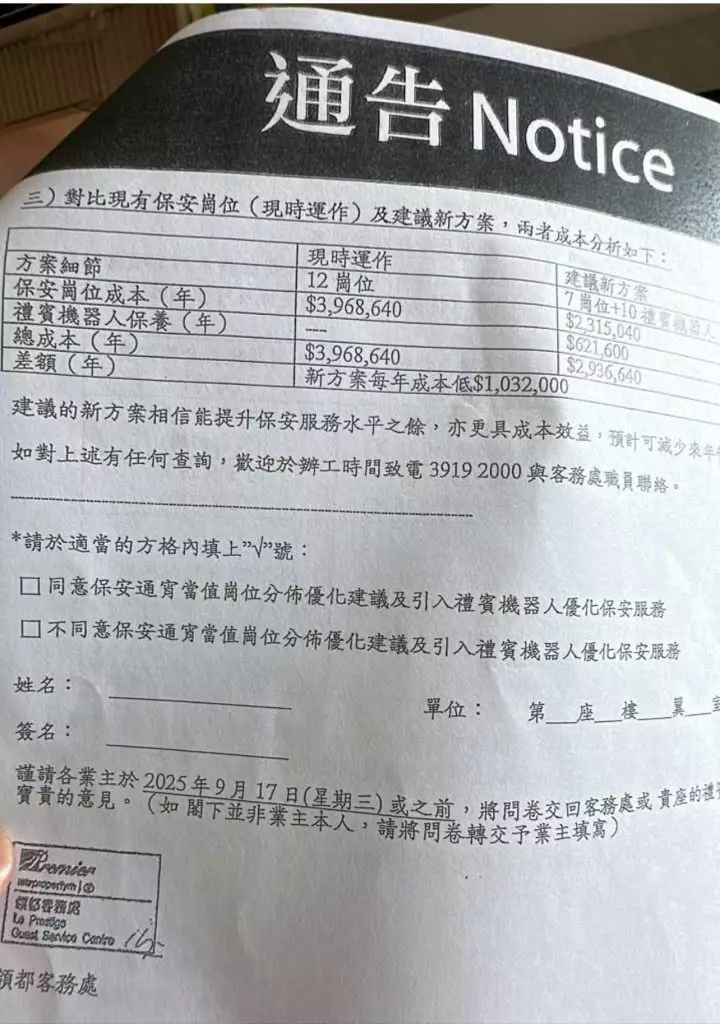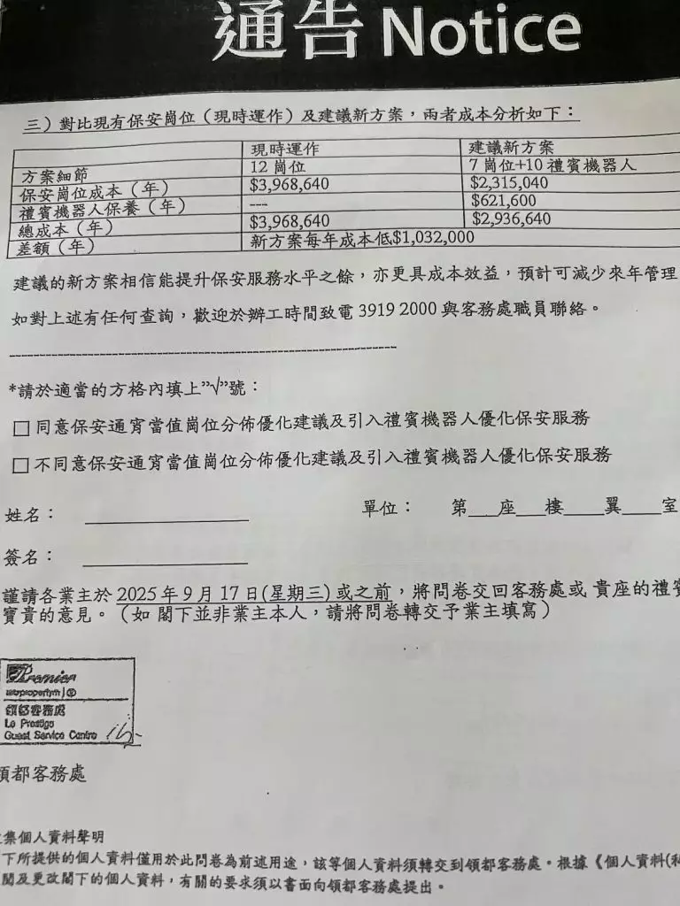 根據問卷內容,領都目前聘有12個保安崗位,每年成本396.9萬元。新方案建議保留7個崗位 ,另配10部禮賓機器人,每年總成本降至293.7萬元,當中機器人保養費用62.2萬元,預計每年 可節省103.2萬元。管理處指,「有關安排能提升保安服務質素,同時具成本效益。」